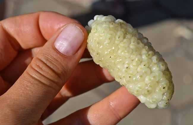 Їх маса вражає — приблизно 7-9 грамів, а довжина складає 5-8 см. Плоди білого кольору з ледь помітним чорним вкрапленням. Смак дуже солодкий, з відтінками нектарину.