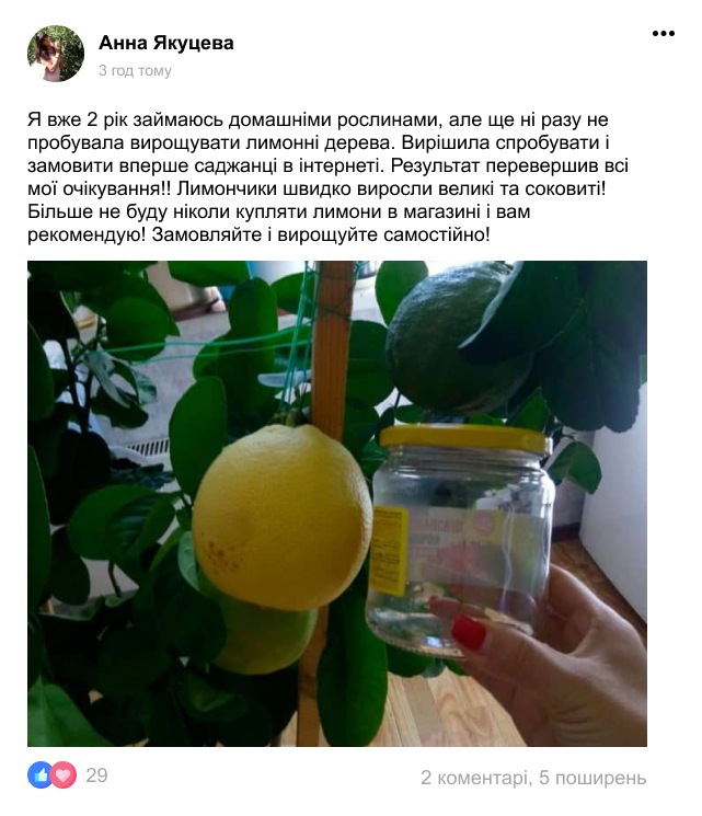 Приблизно рік тому я придбав саджанці лимонного дерева. Був взагалі в шоці, що їх можна вирощувати вдома! Мені все детально розказали, як правильно посадити і доглядати. І ось, після такого успішного врожаю (за рік зібрав десь 8-10 кг лимонів) вирішив оптом замовити тут саджанці, вирощувати і продавати! І не тільки саджанці лимону, а ще й банану, мандаринів і ківі! Тепер на пенсії займаюсь улюбленою справою!